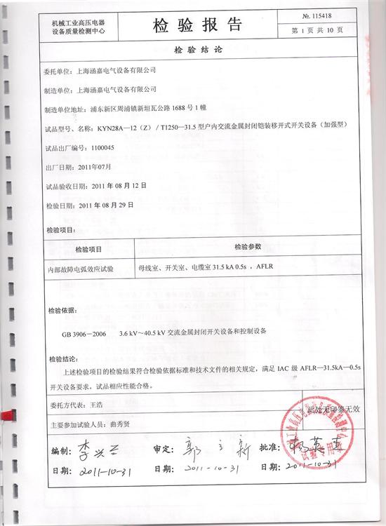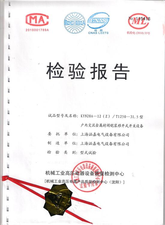 KYN28A-12户内金属铠装移开式开关设备检验报告