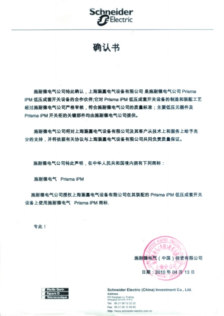 公司与2010年正式与施耐德电气(中国)投资有限公司签订Prisma iPM低压开关柜商务合作伙伴