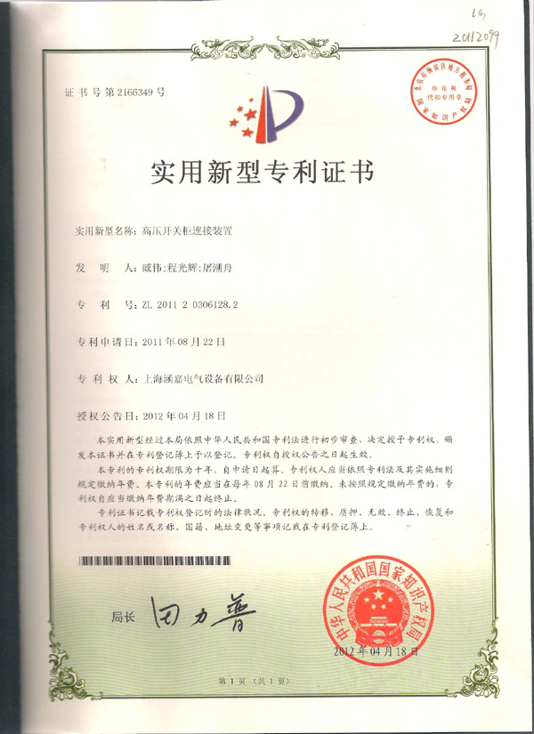 实用新型专利证书:高压开关柜连接装置