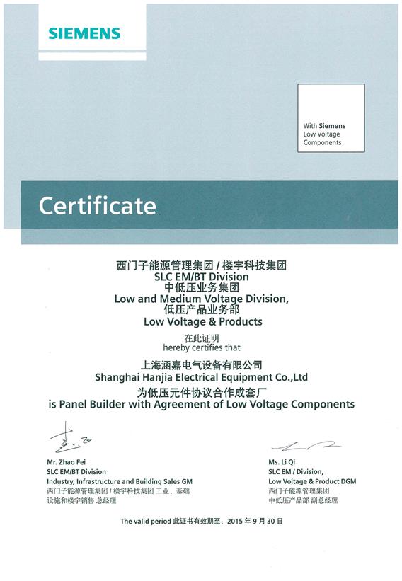 涵嘉电气被授予2015年西门子低压元件协议合作成套厂