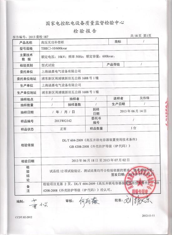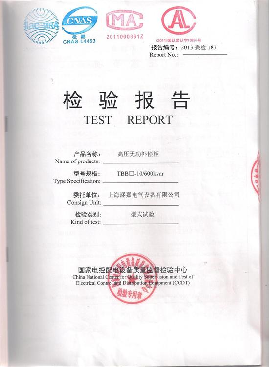 TBB□10/600kvar高压无功补偿柜检验报告